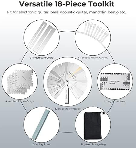 [Comprehensive Measurement Toolkit] Perfectly dial in the performance of your string instruments with our 18-Piece Guitar Toolkit,which includes 9 T-shaped radius gauges, 4 notched radius gauge, 32 blades feeler gauge, 1 string action ruler, 2 fingerboard guard, 1 grinding stone, and 1 zippered storage bag to keep everything organized and accessible.